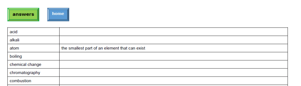 Each word is hyperlinked to a different sheet with the answer on. So clicking on atom takes the user to a different page with this extra information in:
